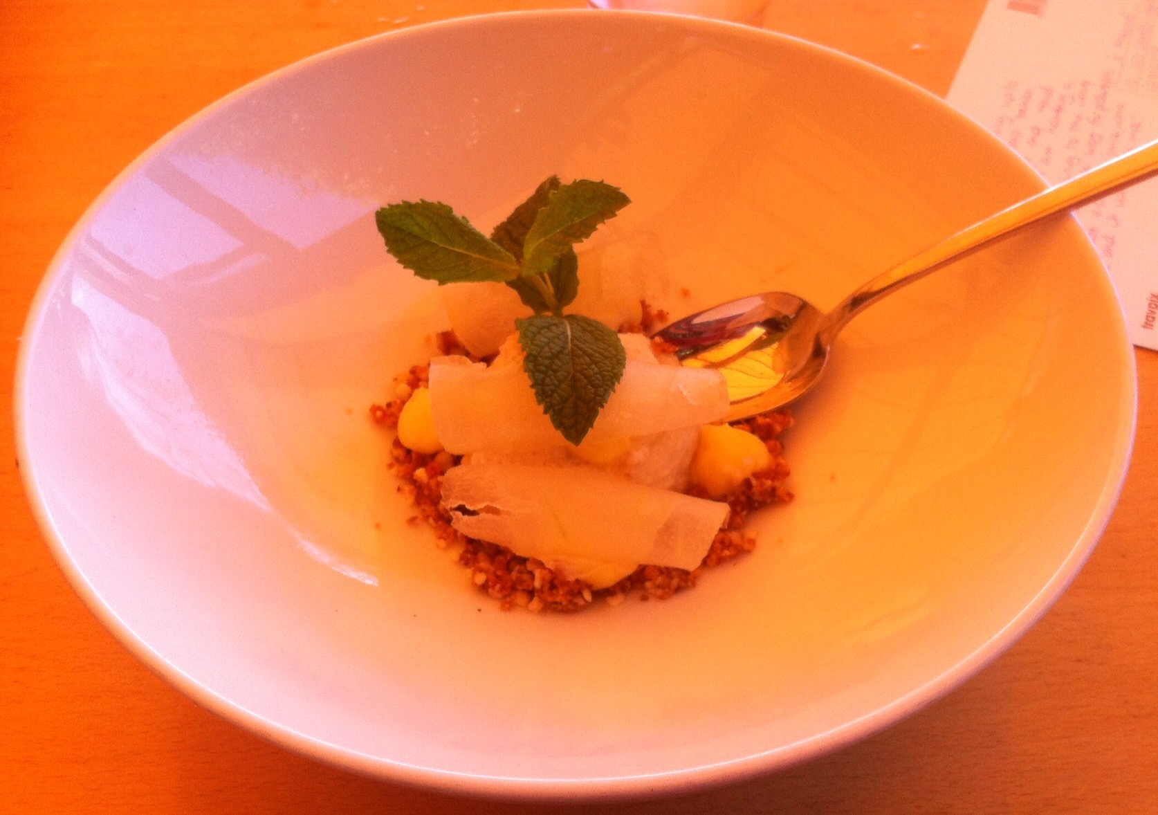 This was also gorgeous and I decided to have dessert too – coconut custard with lemon curd, melon and praline.
