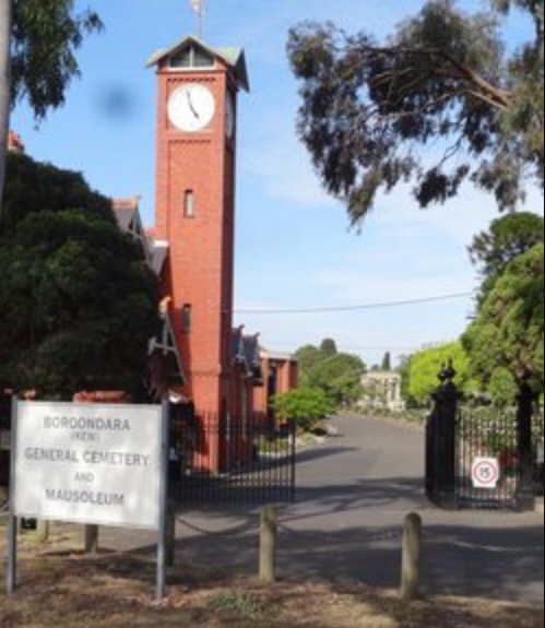 So, with a bottle of water in my bag I set off for Kew cemetery. A couple of tram rides later, the second being quite long, I arrived with the sun still beating down. I got a map and a more detailed diagram showing the position of the grave I was looking for and set off. It was not a long walk but it was hot. I searched in vain for about 20 minutes going from tree to tree to try and keep in the shade. I then decided that I didn’t want to be searching for over an hour again so I rang the office up and the lady who answered persuaded me to go back to the entrance and go and see her in the office. She would then explain exactly how to find it. I asked if I was nearby and I explained I could see a drooping tree of some sort? I gave in and went back to the office. The lady greeted me with an offer of a drink of cold water and a cool down in the ,airconditioning which I gratefully accepted. I explained who I was looking for and showed her the maps I had and she gave me another map which included numbers and names on gravestones. She also gave me explicit directions to the grave.
