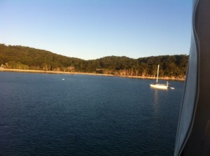Arrived at Maryborough at 2:30 and boarded a coach transfer to the ferry to Fraser Island at 3:30. We were late due to a slight delay on the Tilt Train but the ferry waited for us and was off before it had fully lifted the gangplank! We had a lovely smooth crossing looking for dolphins along the way. It was glorious weather and beautiful views – no dolphins though!